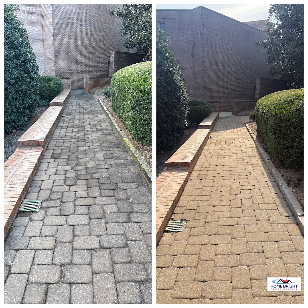 Home Bright Power Washing completed a soft washing and power washing project at First Baptist Church in Greenville, SC. The work covered several outdoor areas used daily by the congregation, including paver sidewalks, the labyrinth area, and the church columbariums. As a local church, First Baptist needed careful cleaning that preserved delicate surfaces while removing built-up grime.